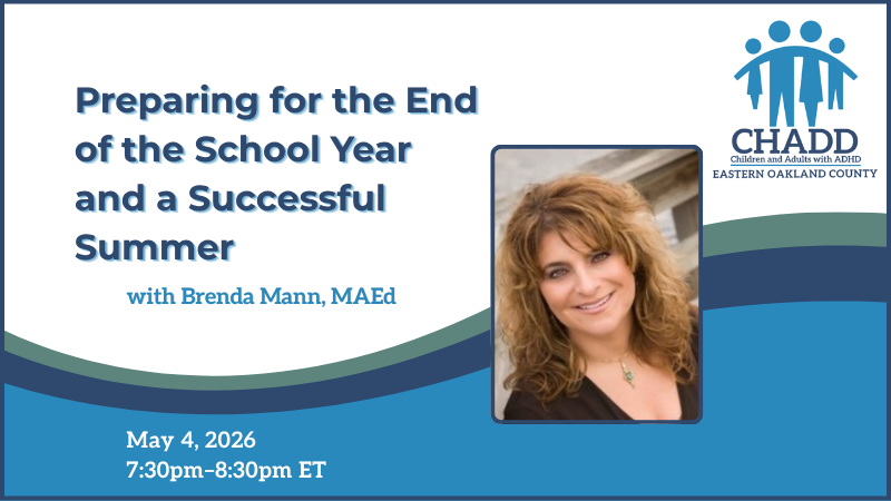 Join Eastern Oakland County CHADD as they host Brenda Mann, MAEd, who will help parents prepare their children for the end of the school year and plan for a successful summer. She will give parents effective strategies for meeting their responsibilities as school nears completion and assist them in developing appropriate activity plans for children that combine recreation with learning during the summer.