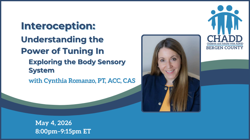 Join Bergen County CHADD in this engaging session as they host Cynthia Romanzo as she discusses the meaning of interoception and its role in maintaining health and balance in our lives. She will share how interoception is challenging for neurodiverse individuals and highlight ways to improve interoceptive awareness.